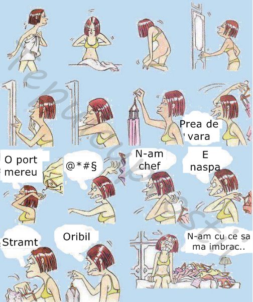 In toata casa exista 4 sifoniere cu cate doua usi (3 sunt pana in tavan) si 2 comode. Cred ca e inutil de precizat ca hainele din cele 3 si o comoda sunt ale mele. Dar am in permanenta senzatia de panica cum ca nu am cu ce ma imbraca si ca trebuie tot timpul sa-mi mai iau cate ceva. Si asa am bagat o multime de bani in niste haine pe care nu le-am purtat in veci si pe care nu stiu daca le voi imbraca vreodata. Toate ca toate, dar cred ca am inceput sa ma panichez pe tema asta in momentul cand ma uitam la doua emisiuni (Hoarders si Bunuri care ne consuma) pe un canal TLC, despre oamenii care strang si strang si nu vor sa renunte la tot ceea ce au strans intr-o viata, chit ca le acapareaza viata insasi. Inca n-am ajuns in stadiul asta, dar nu-mi prevad un viitor prea stralucit. Pentru ca am redus cumparaturile - slava Cerului ca mi s-au imputinat banii de cheltuiala - dar nu stiu deloc cum sa fac sa renunt la hainele pe care le-am cumparat deja, care-mi sunt de altfel foarte dragi si de care n-as vrea de fapt sa ma despart si imi ocupa spatiul degeaba prin dulapuri si sertare, pentru ca nu le (mai) port :(