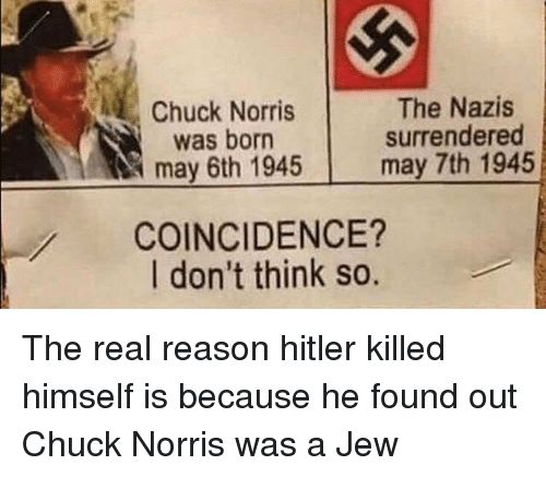 Și, pentru cei care nu știau: Chuck Norris s-a născut într-o cabană construită de el și vorbește chineza în trei limbi străine.