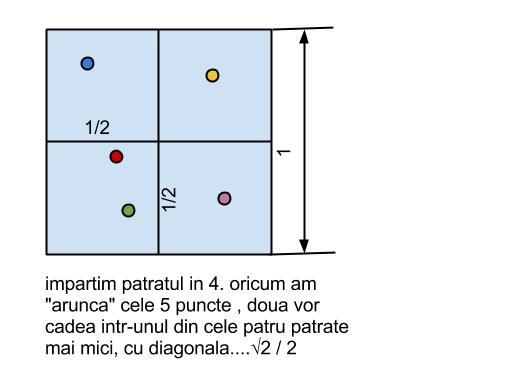 Impartim patratul in 4 patrate egale,fiecare cu latura de 0,5. In fiecare dintre ele,distanta cea mai mare dintre 2 puncte este, evident,diagonala,adica sqrt(2)/2. Ceea ce inseamna ca intr-un patrat mic nu exista 2 puncte care se afla la o distanta mai mare de sqrt(2)/2,adica putem situa in fiecare doar un punct. In total 4. Ramanem insa cu ultimul punct,care nu poate fi situat nicaieri... nici macar in centru,pentru ca distanta maxima catre cele 4 puncte ar fi chiar sqrt(2)/2,daca cele 4 puncte ar fi in colturi.