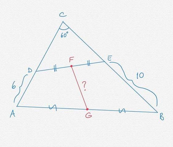 Teorema medianei, DN=√[DA²+DM²+2∙DA∙DM∙cos(ADM)]/2 = √[6²+10²+2∙6∙10∙cos(60°)]/2 = √196/2 = 7