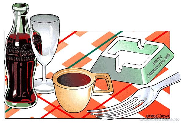 Scrisul de pe sticla (Coca Coca in loc de Coca Cola), unghiul paharului, toarta canii, suportul de tigara din scrumiera, dintii furculitei, scrisul de pe patea laterala a scrumierei (is de doua ori). |