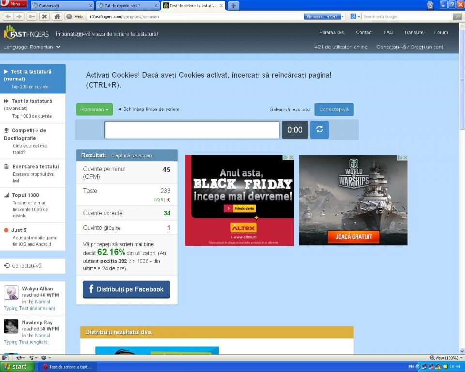 Aici puteti testa cat de repde scrieti. Trebuie sa tastati cuvintele ce apar in lista. Rezultatul meu: You reached 222 points, so you achieved position 6344 of 25091 on the ranking list You type 345 characters per minute You have 59 correct words and you have 5 wrong words