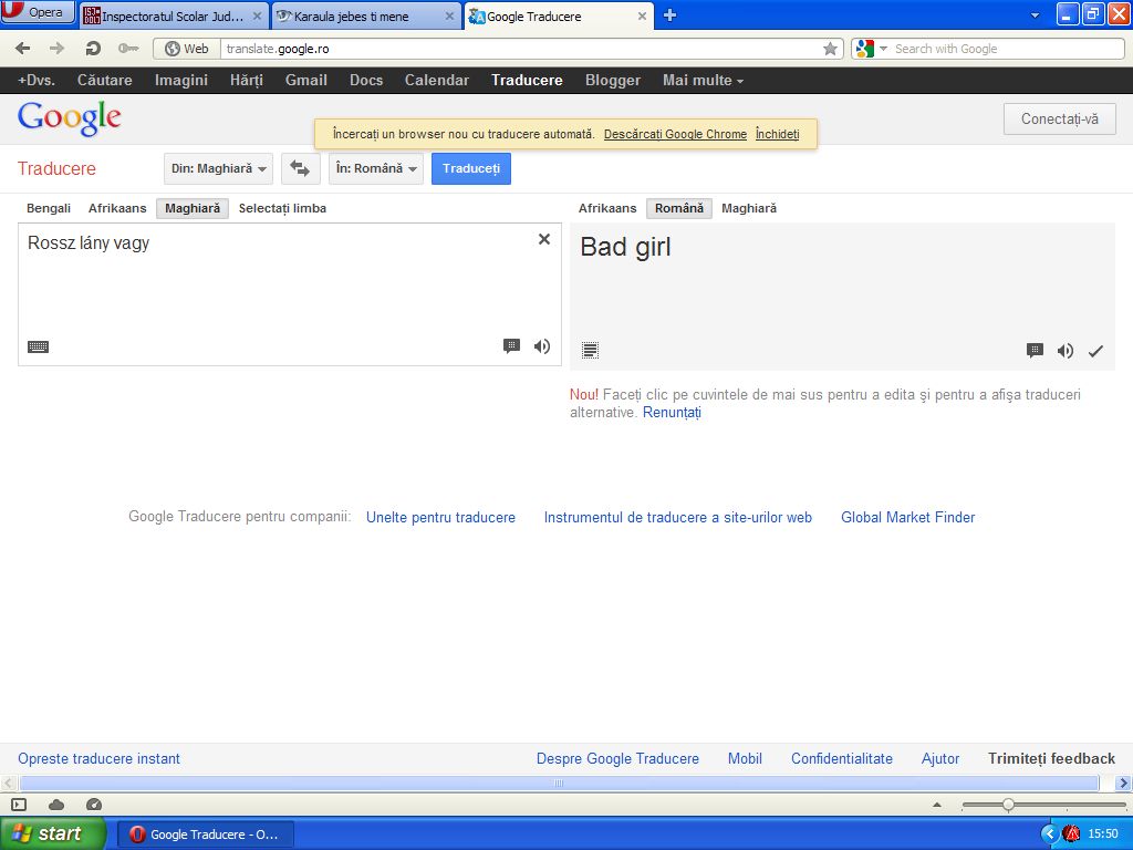 aisha RE: =))))))))))))))))) Cautai traducerea in romana si uite rezultatul: "Bad girl" ... Google o lua pe zaibar! |