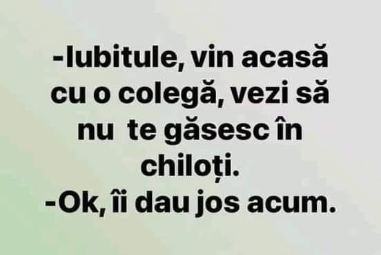 - Iubitule, vin acasă cu o colega, vezi sa nu te găsesc în chiloți. - Ok, ii dau jos acum. |