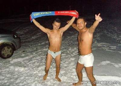 Nu inteleg ce e funny la poza asta :| ! Doi idioti care se plimba dezbracati prin zapada cu fularul celei mai stupide echipe din Romania :| :-??