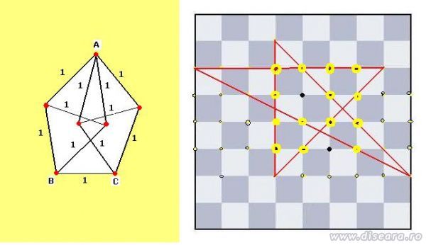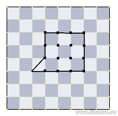 Uniti cat mai multe din cele 16 puncte negre cu o linie franta continua ,formata din 5 segmente, astfel incat punctul initial sa coincida cu punctul final ,fara a iesi de pe tabla de sah din desen. |