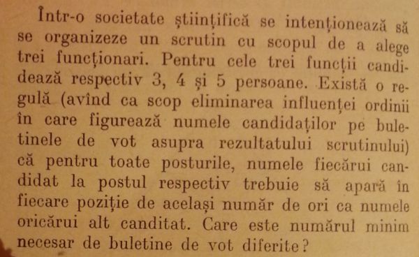 -pentru a treia functie candideaza cinci persoane (A, B, C, D, E) si se tiparesc 5! = 120 de buletine de vot distincte.