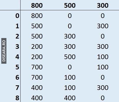 Exista o varianta cu doar 8 permutari. Ar trebui sa fie evident ca primele doua sunt umplerea borcanului de 300 si turnarea continutului in borcanul de 500. Abia de aici incolo se complica lucrurile. Daca umplem din nou borcanul de 300 si din el turnam ciorba in cel de 500 pana cand acesta se umple, apoi golim borcanul de 500 in cel mare, avem 700 ml de ciorba in borcanul mare si 100 in cel mic. Iar de aici cred ca oricine se descurca singur. Pentru cei care nu se descurca, mai jos este un tabel care descrie simplu toti pasii. |