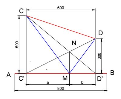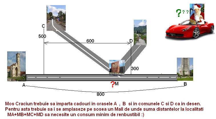 Notam cu x distanta de la M la proiectia punctului C pe dreapta AB. atunci distantele se exprima astfel: MC = sqrt(500^2+x^2) MD = sqrt(500^2+(600-x)^2) MA+MB = 800 F(x) = MA+MB+MC+MD = sqrt(500^2+x^2) + sqrt(500^2+(600-x)^2) + 800 Minimum functiei se obine pt x = 300 (Mall-ul se amplaseza 300m de proiectia punctului C pe dreapta AB. Triunghiul CDM este isoscel.(CD = 600,MC = MB = sqrt(500^2+300^2)=583.1m Suma distantelor = 800+2*583.1 = 800+1166.2=1966.2 |
