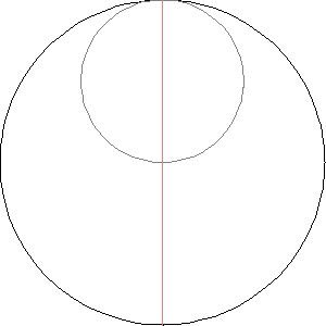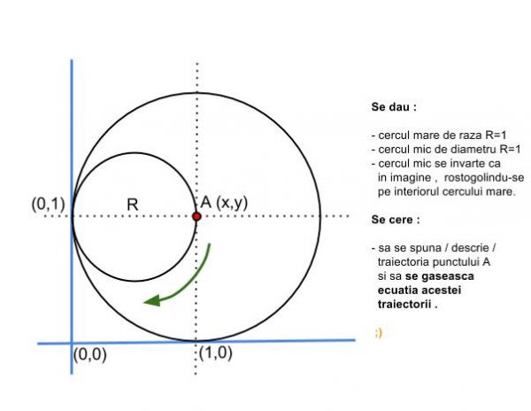 Cand raza cercului mic este 1/4 din raza cercului mare, situatia este diferita, rezultand curba numita astroida care e ca un patrat cu laturile curbate in interior, in care x=cos^3(t), y=sin^3(t)... http://ro.wikipedia.org/wiki/Astroidă, iar cand raportul razelor este 1/3, rezulta curba deltoida care e ca un triunghi echilateral cu laturi curbate, http://en.wikipedia.org/wiki/Deltoid_curve...este intuitiv deci in cazul raportului 1/2 sa rezulte o figura degenerata la un segment, diametrul vertical al cercului mare... |