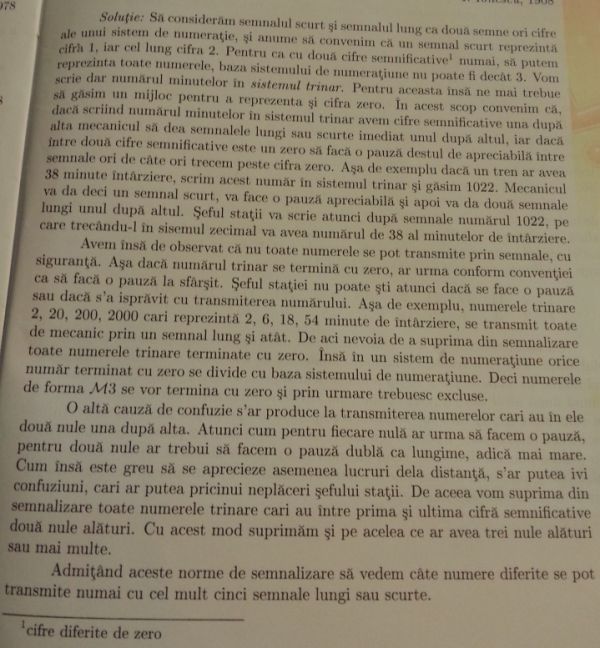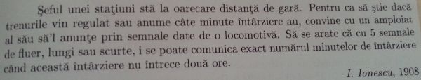 Intr-adevar șeful statie era baiat ...deștept :)) pentru că a cerut mecanicilor locomotivelor sa-l înștiințeze pentru intarzieri mai mici sau egale cu 120 minute. Cu o combinatie de doar 5 semnale (scurt sau lung) nu poti "genera" numarul 121. Iata de ce: cu 5 semnale poti genera 5! permutari .(5! - 1*2*3*4*5 = 120) deci 120 de combinatii distincte , fiecare asociata unuia din numerele (minutele) de la 1 la 120 (2 ore).