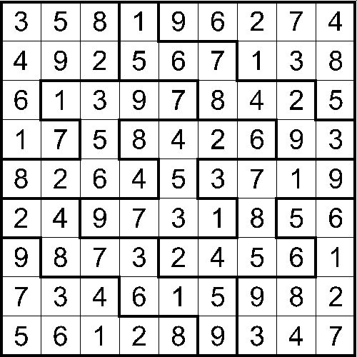 Sa se rezolve careul de mai jos (cu numerele de la 1 pana la 9), astfel incat niciun numar sa nu se repete pe niciun rand, coloana sau in blocurile alcatuite din casute colorate identic.