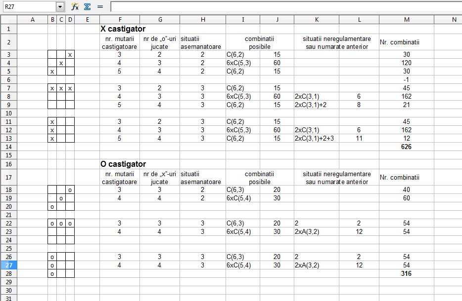 Am facut un programel de "numarat" variantele bune si mi-a dat: X castigator: 942 O castigator: 412 Egalitate: 16 N-ar strica un calcul de verificare, cu combinatii, dar asta poate mai tarziu... |