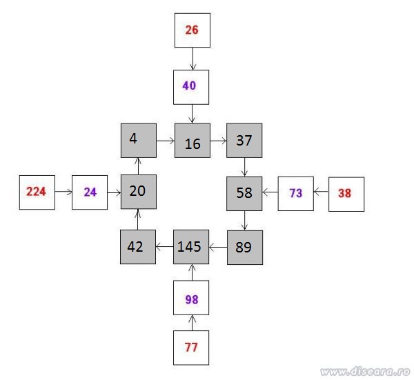 Numerle din patratelele care nu sunt verzi reprezinta suma patratelor cifrelor numarului din care deriva (sugerat de directia sagetii).