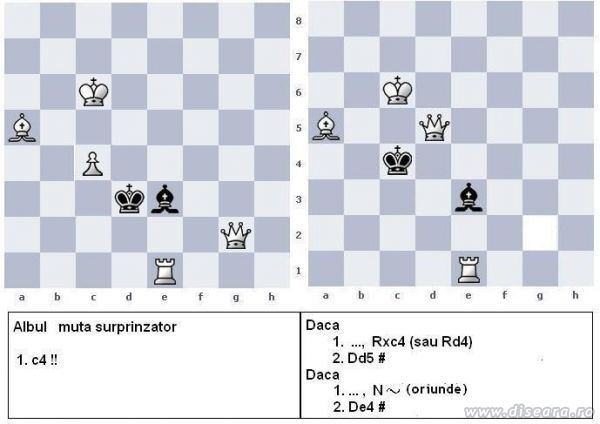 Dati mat cu piesele albe in doar 2 mutari. Diagrama contine : Alb : Rc6, Dg3, Te1, Na5, c3 Negru : Rd3, Ne3. Bonus : Care din numele oraselor urmatoare nu trebuie sa fie in sir ? ARAD , BACAU , CLUJ , DEVA , IASI