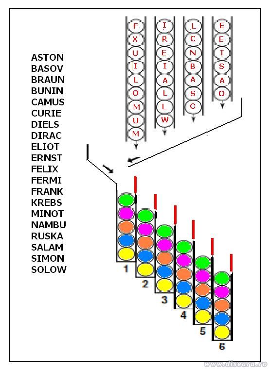 Eliberati sferele in asa fel incat sa va permita sa obtineti in fiecare din tuburile 1-6 ,numele unui laureat al premiului Nobel ,nume care sa poata fi citit de sus in jos .Numele se pot alege din lista alaturata ordonata alfabetic.